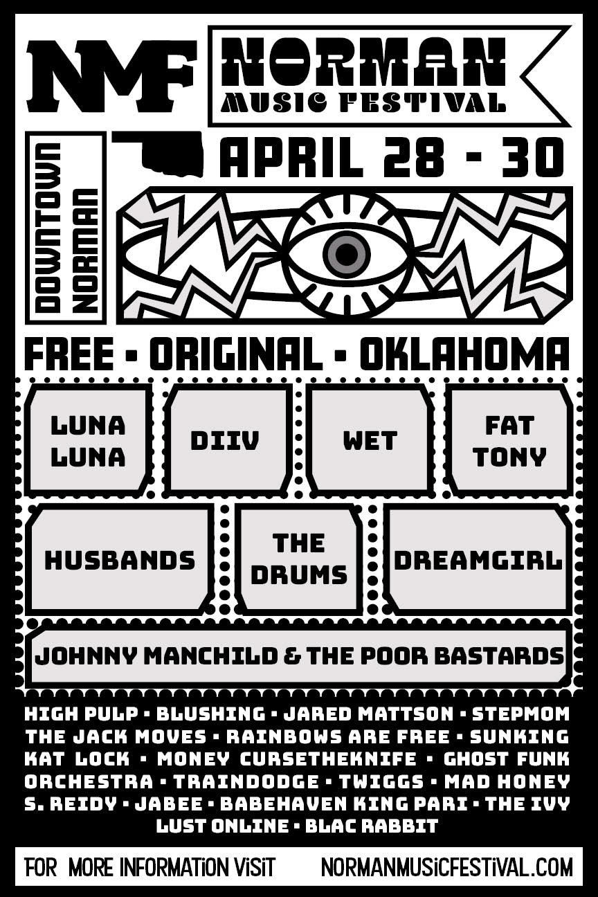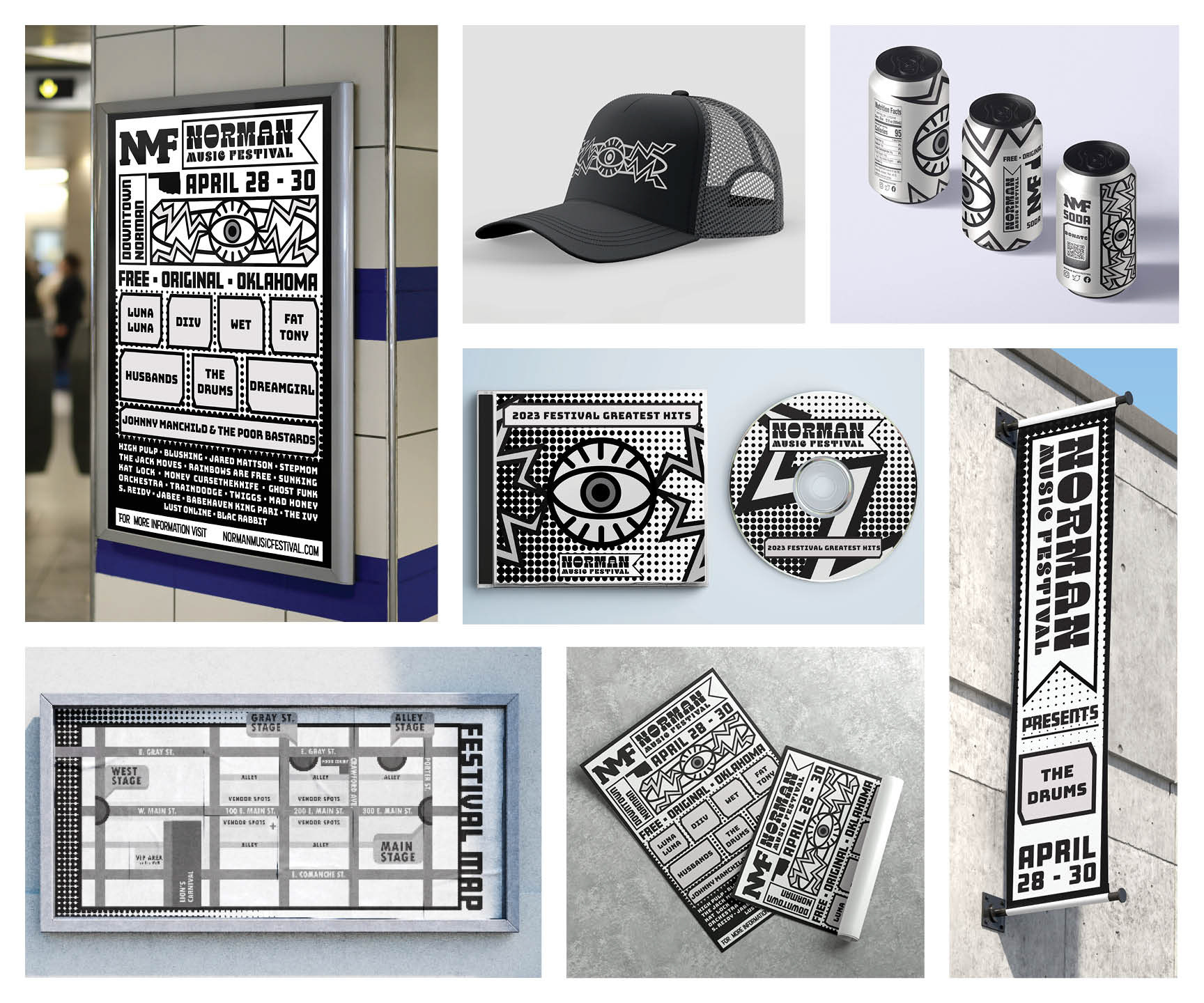 I selected the Norman Music Festival in Oklahoma to fully reimage and approach the design with an intentional constraint: a strictly grayscale palette. Relying solely on tonal variation, I combined clean san serif typography with halftone textures and subtle country-inspired motifs to capture the spirit of the event. The final layout achieves a sleek yet complex aesthetic, demonstrating how limited color and thoughtful composition can create a memorable, muli-purpose festival piece.