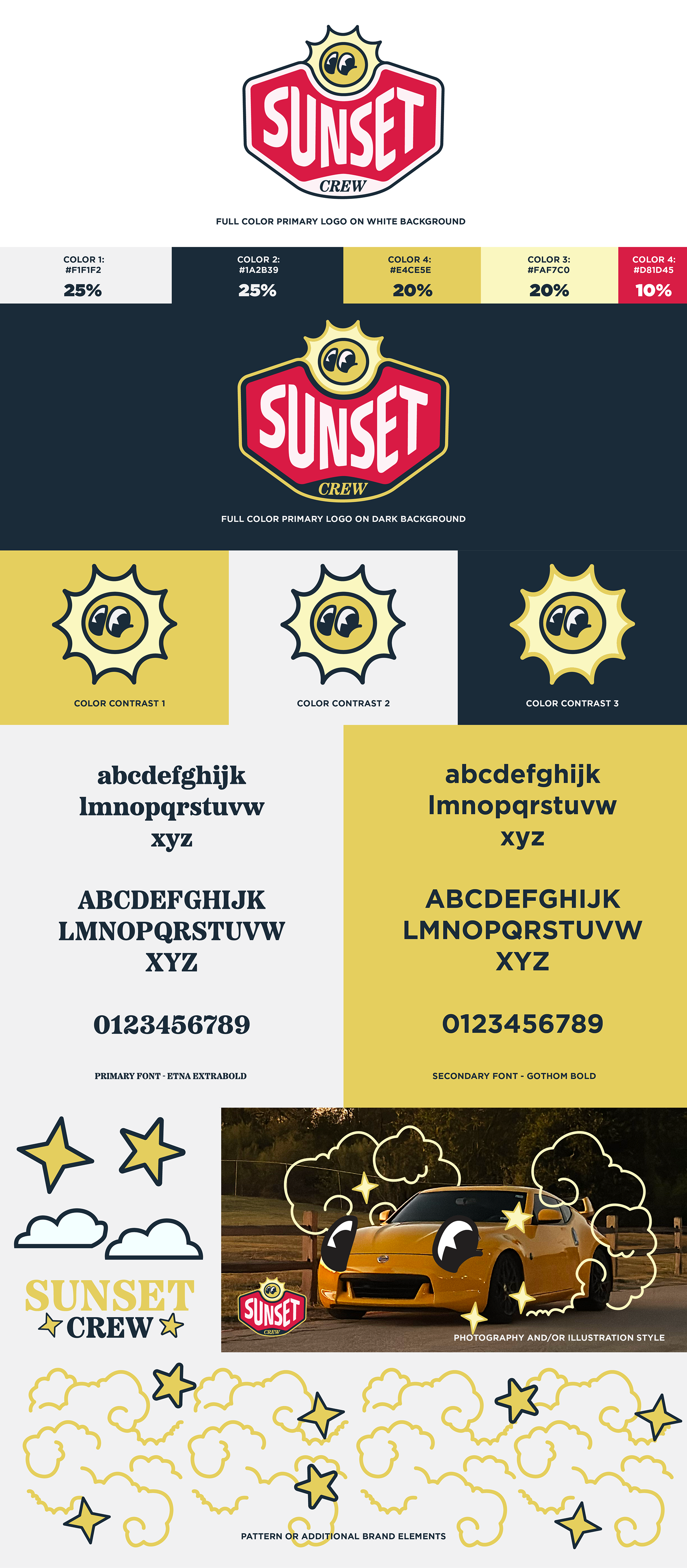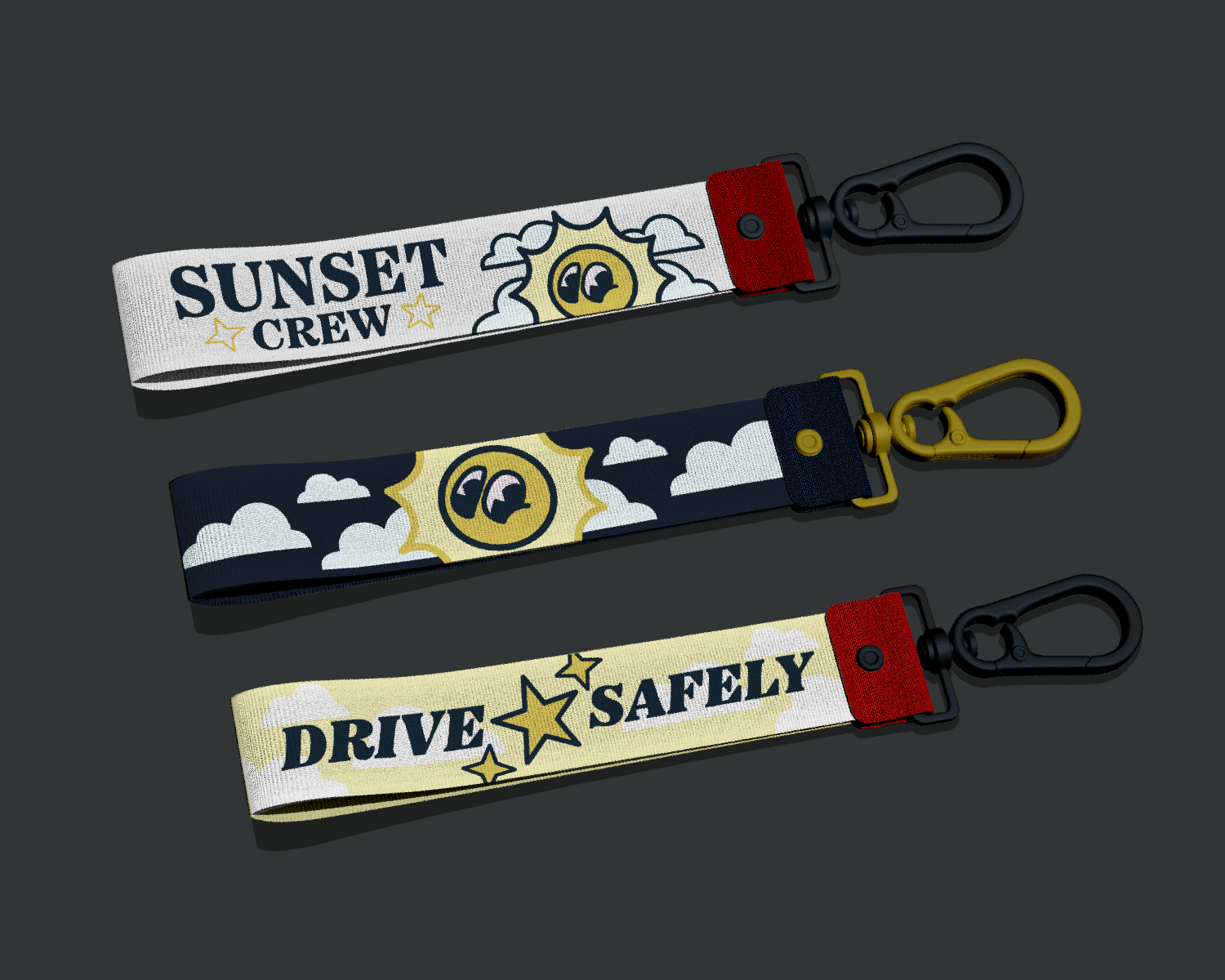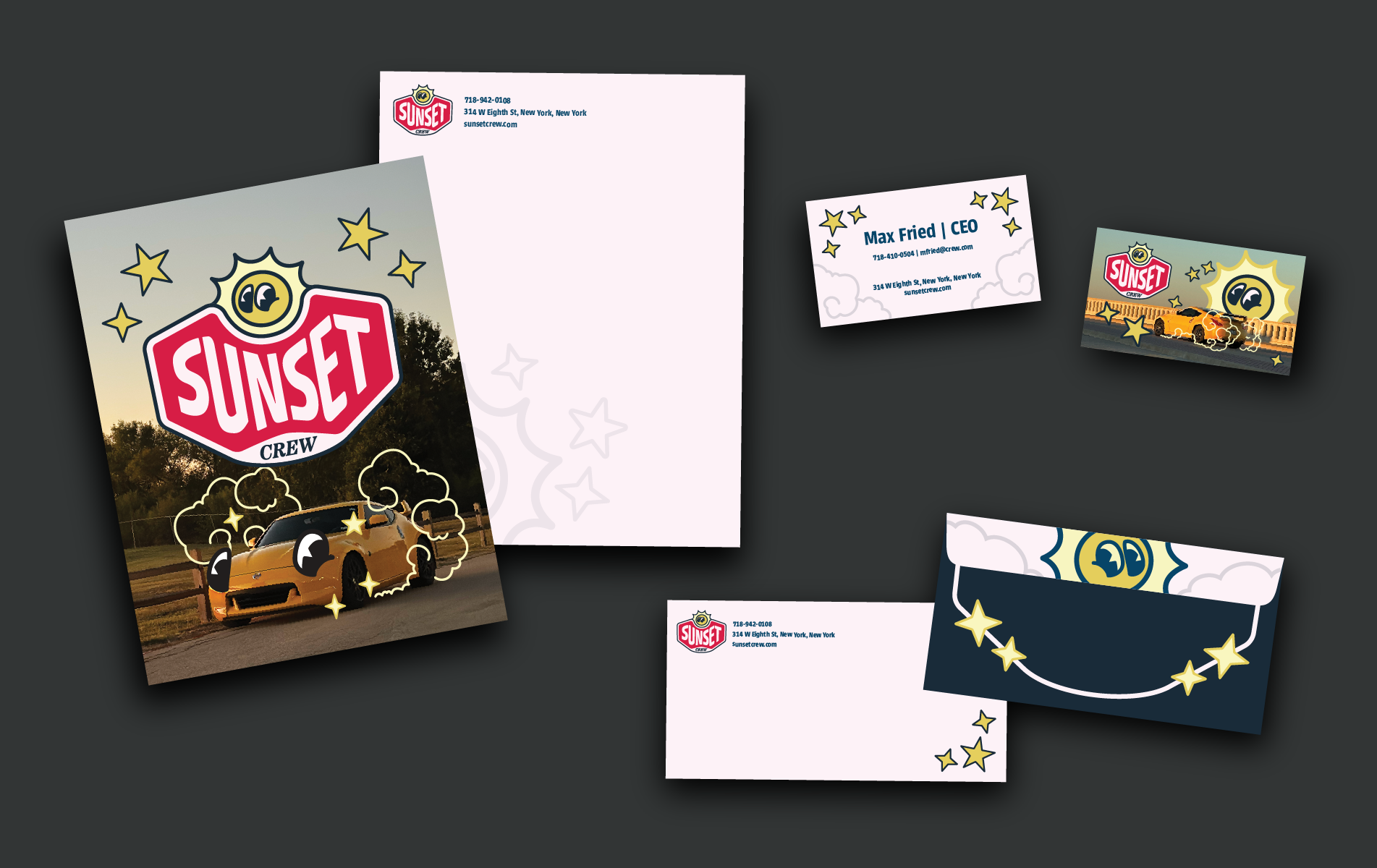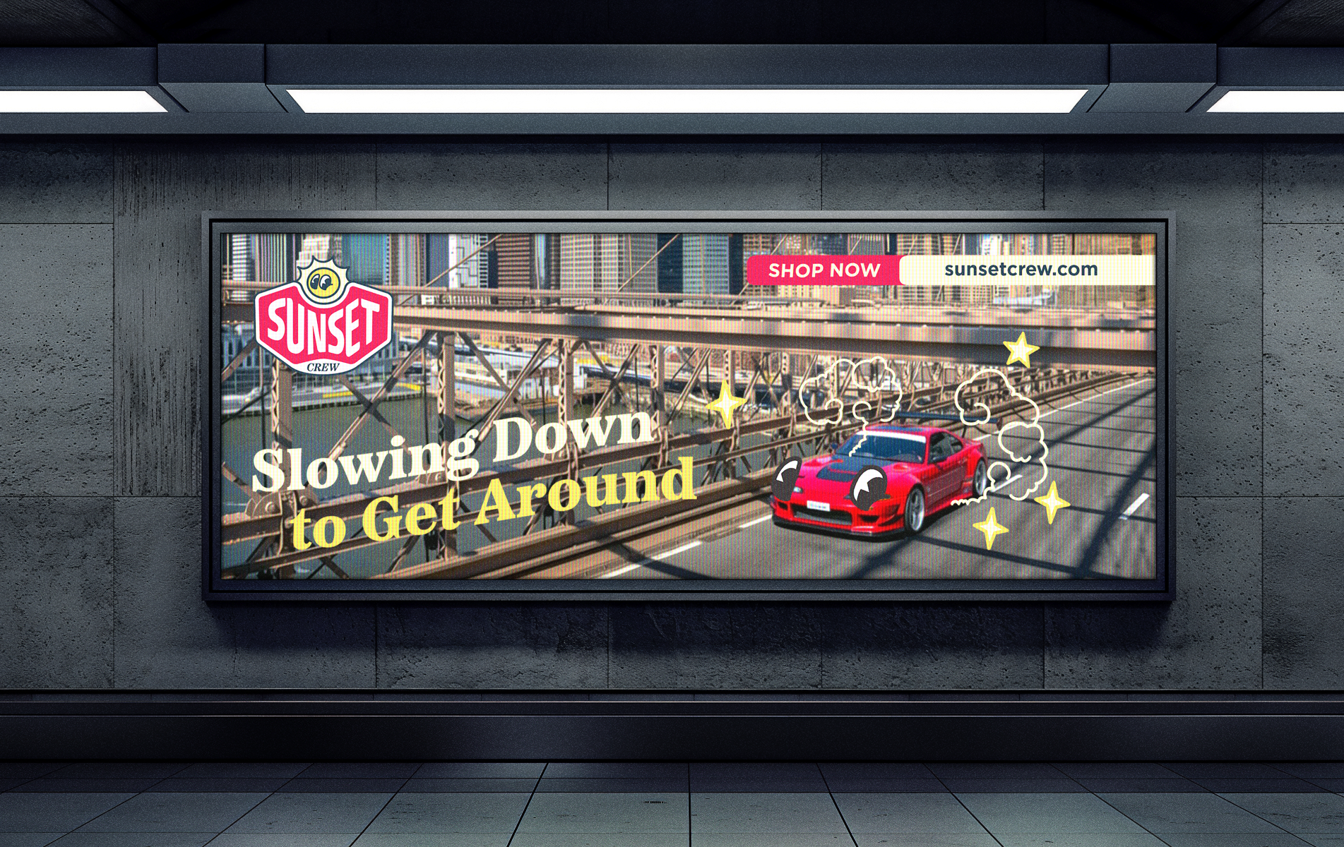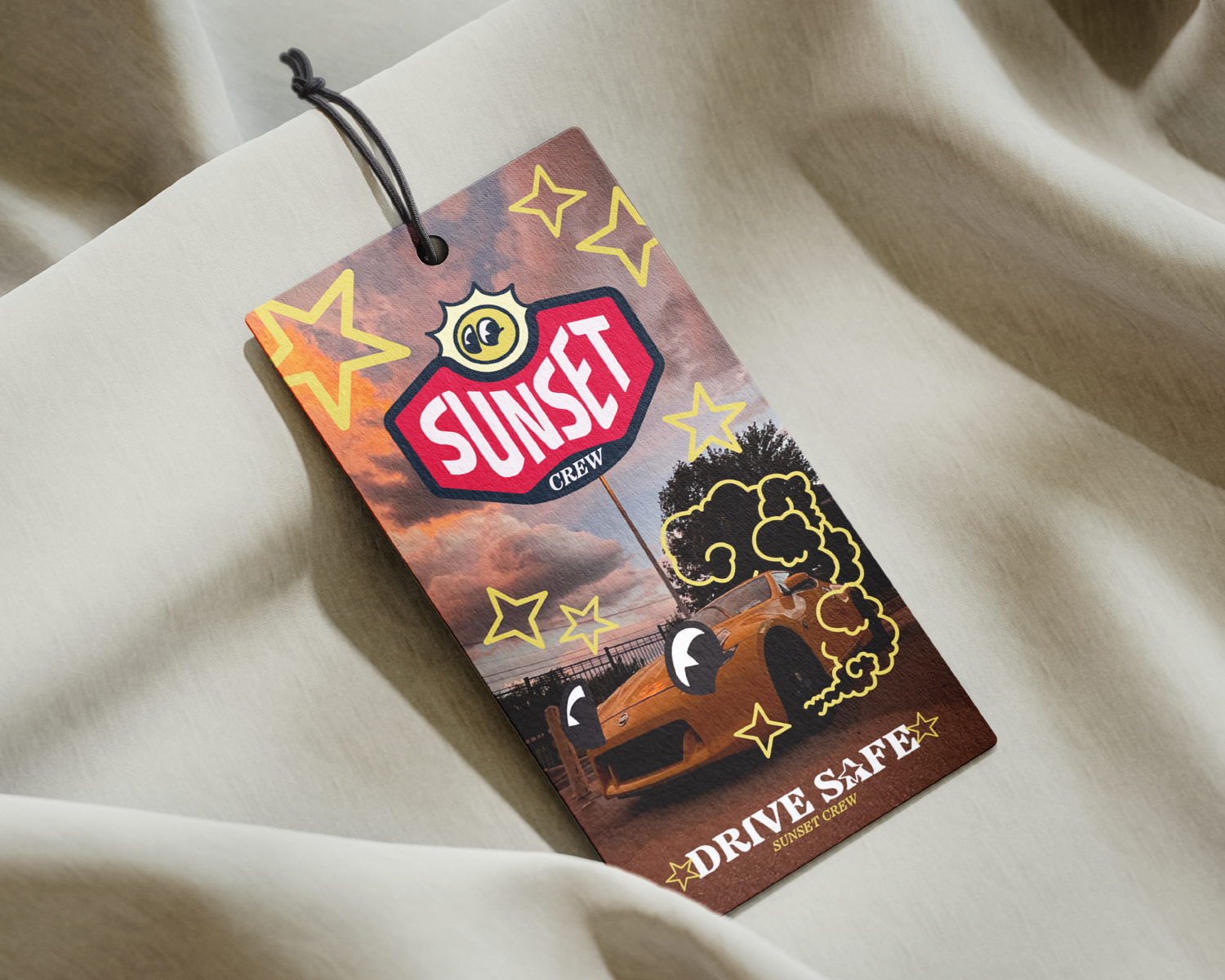 For my capstone project, “Sunset Crew” was developed as a fictional racing-lifestyle brand offering car accessories and merchandise. The goal was to build a complete visual identity system from the ground up and produce physical items that showcased the brand’s personality in a cohesive, professional way.